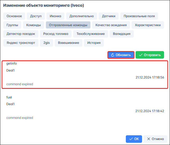 Для обновления статуса отправленной команды нажмите кнопку Обновить: