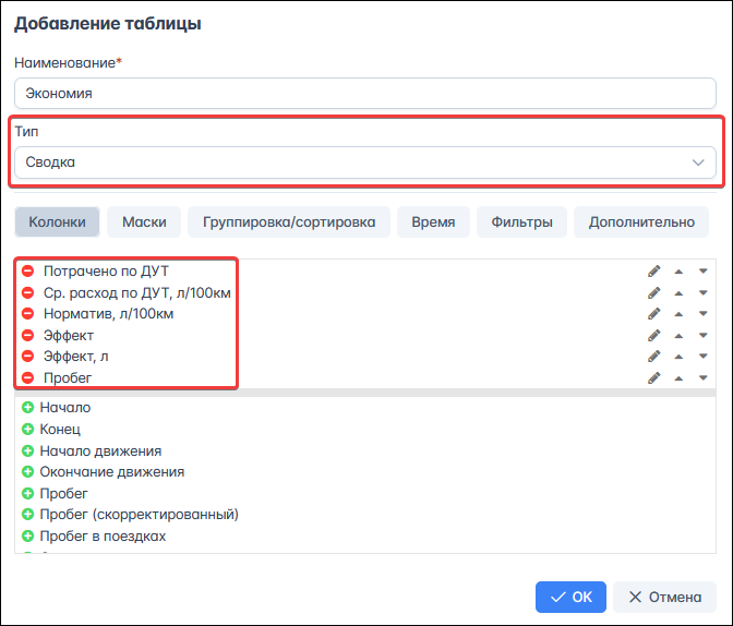 На вкладке Содержимое нажмите кнопку Добавить таблицу. Выберите тип таблицы Сводка. Добавьте в таблицу колонки Пробег, Моточасы и Утилизация.