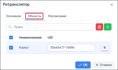 Во вкладке Объекты выберите транспортные средства учетной записи, по которым будет осуществляться ретрансляция: